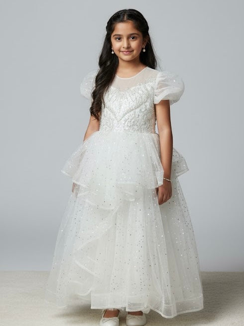 The Eloise Gown flaunts a classic ballgown with layers of soft tulle. A round neckline and balloon sleeves accentuates the elengance and glamour of the dress. She will be the most sparkly girl in the room with the beaded details in this grandoise piece. Best of all, this dress is surprisingly easy to put on just by zipping up! Comfortable and yet fashionable? It doesn't get better than this!